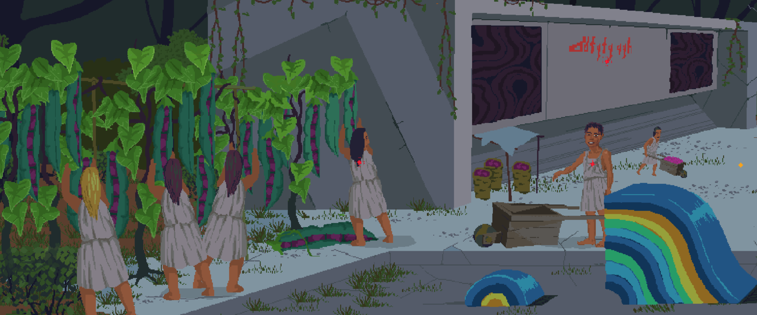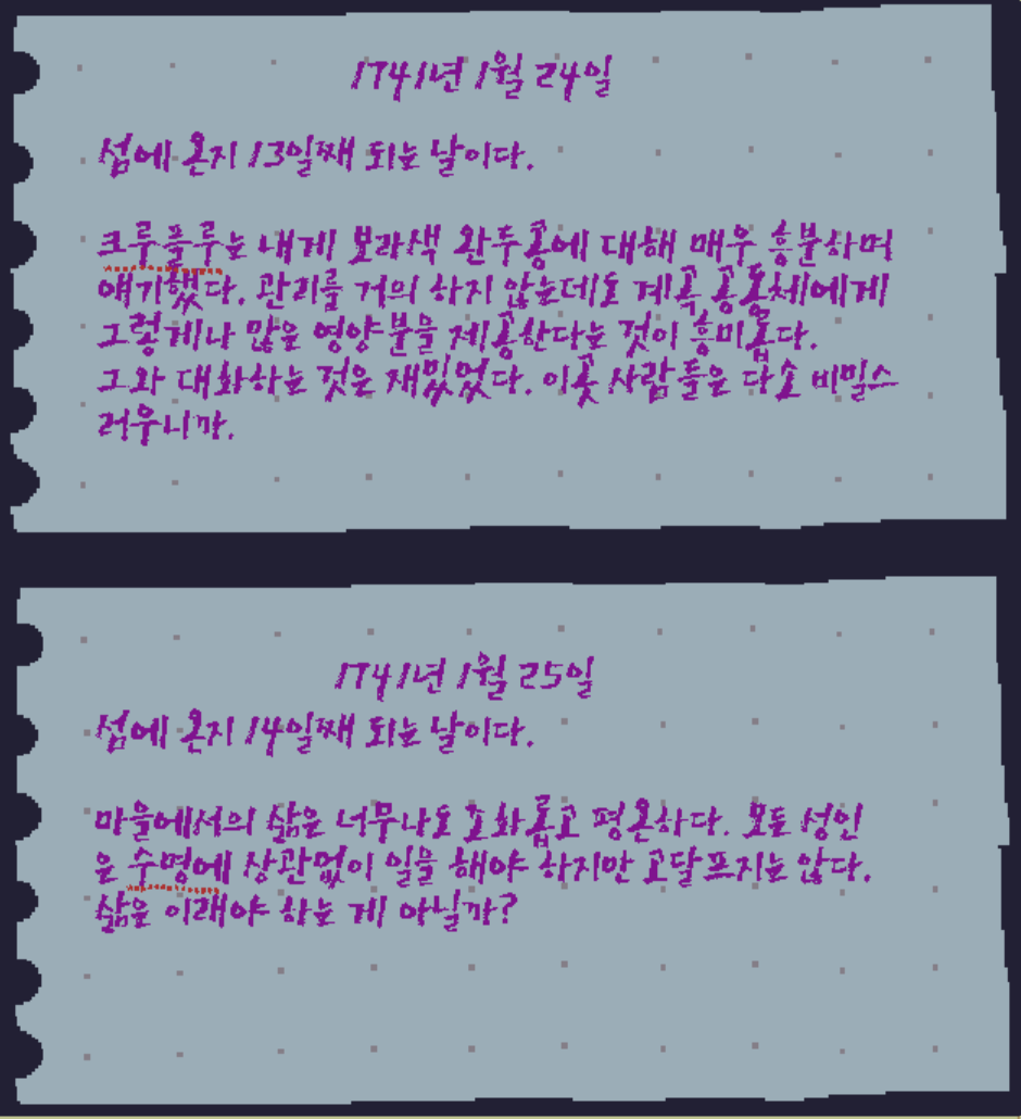 섬에 온지 14일째 되는 날이라고 하는 것을 보니 아까 월드맵에서 봤던 점, 줄, 세모는 시간의 흐름을 나타낸 것 같다.