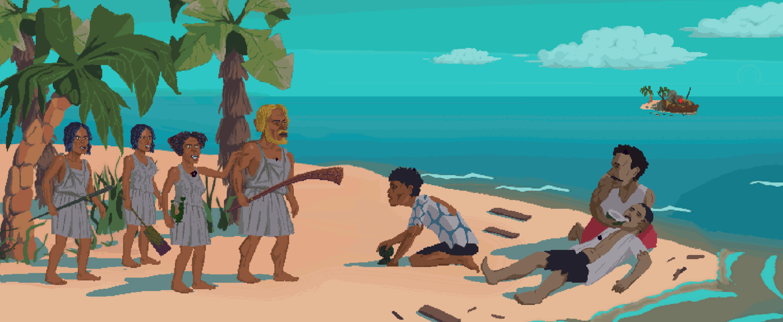 그 결과 배는 난파당했고, 겨우 살아남은 세사람은 섬에 사는 듯한 주민들에게 발각된다.