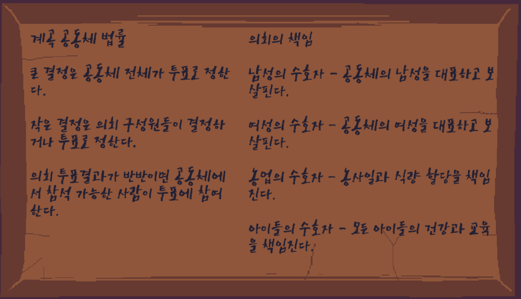 남성의 수호자, 여성의 수호자, 농업의 수호자, 아이들의 수호자 이렇게 4명이 의회의 구성원인 것 같다.